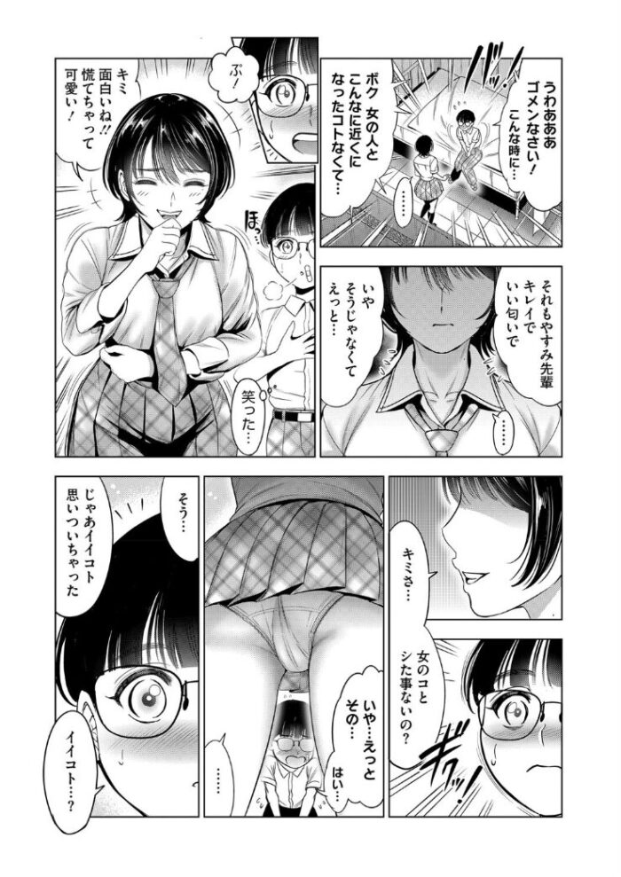 童貞の優木をリードするところも細かく描かれていて、ところどころに出てくるやすみ先輩の小ぶりなお尻も綺麗でした。優木の初めて感じる快楽に優しい眼差しを向けるが、挿入シーンになったときは、受け身でよがりまくっていた優木が急に責めで激しくなって、やすみ先輩も恍惚の表情になってエロくてよかったです。