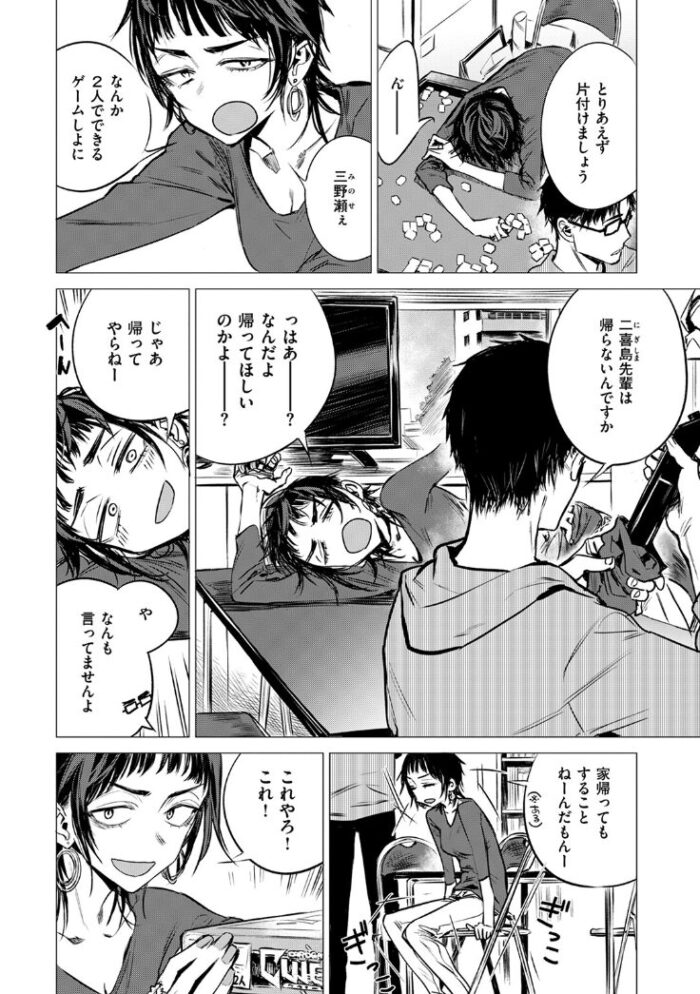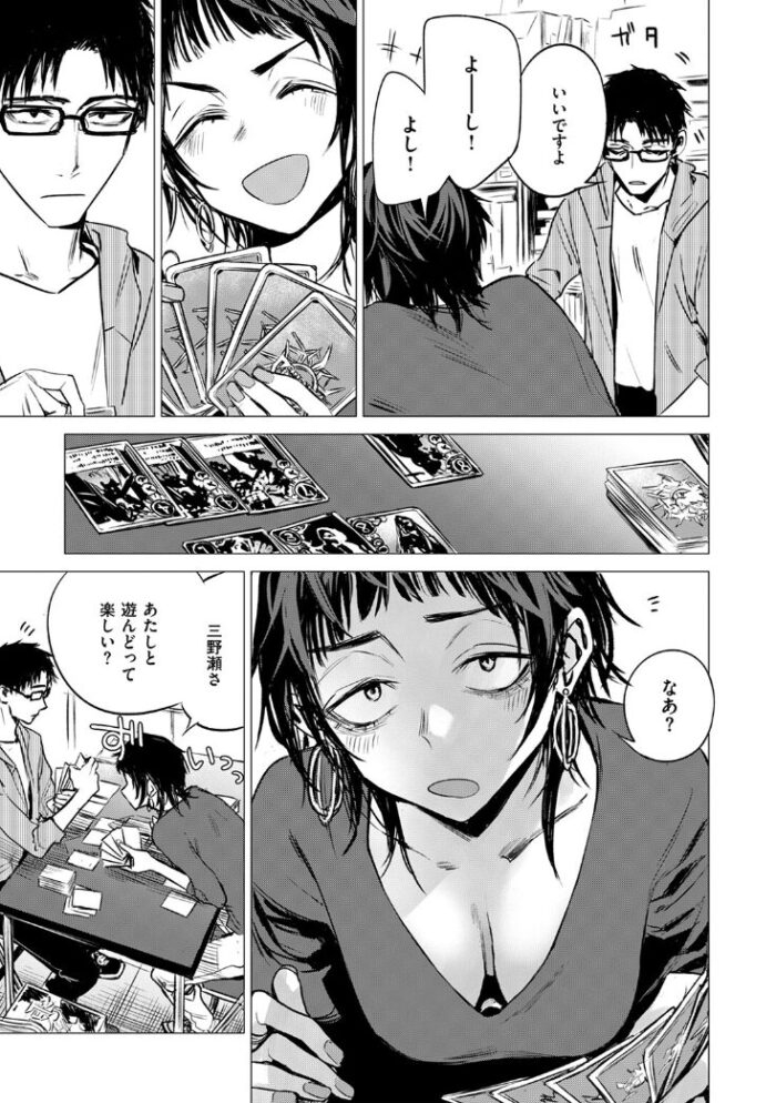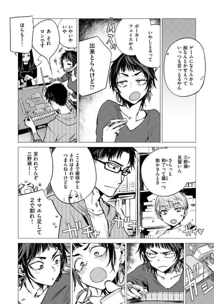 女の先輩の二喜島に呼び出され、その他2人と共に麻雀を打つことになった三野瀬ですが、その誘いを内心では喜んでいながら、全く表情には出さないクールさが何とも気になりました。