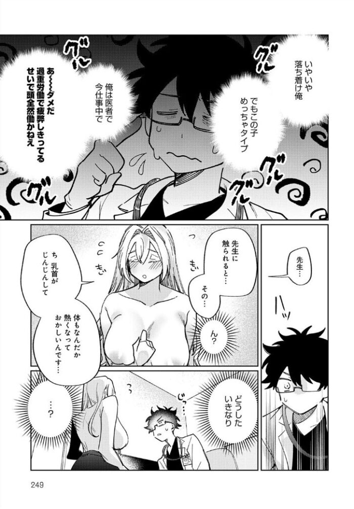 最初主人公のお医者さんは規定に従って正しい医療行為を行っていたんですが、患者であるお嬢様がなぜかそれに過剰反応を示してしまうんですね。元々限界点に達していたお医者さんは、彼女の反応に理性が崩壊してとうとうふらちな行為に及んじゃう。