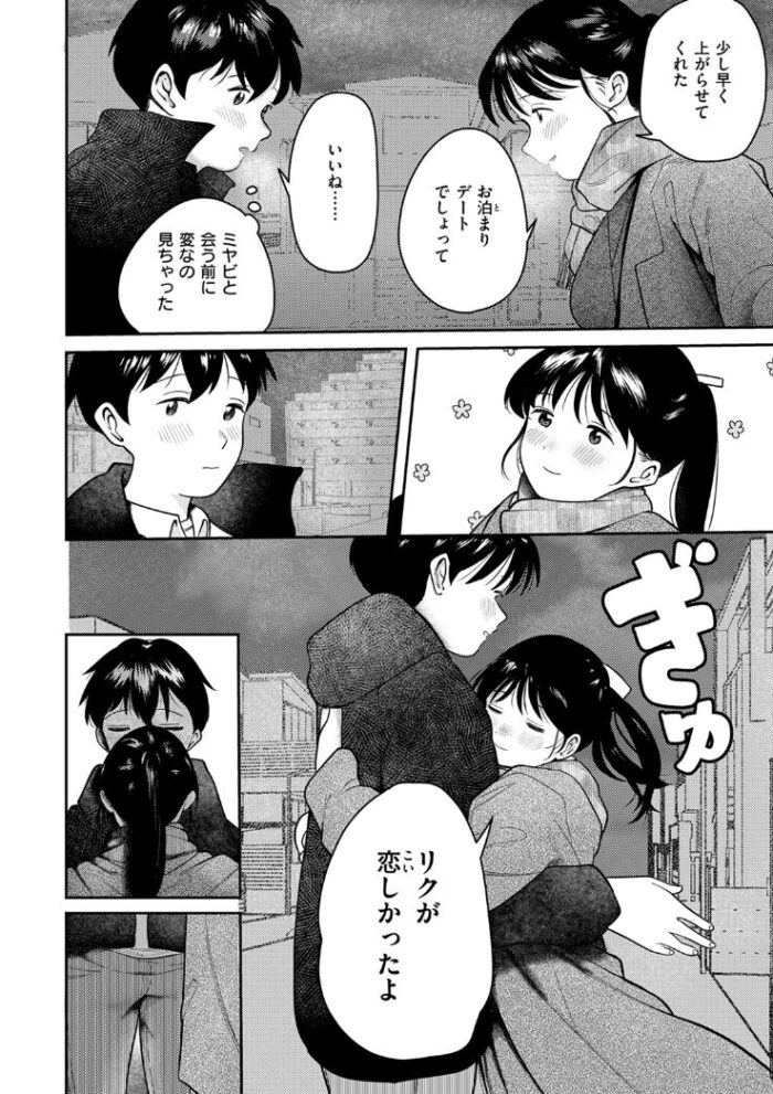 彼女とのお泊りデートの日に、ネットで嫌な文字を見てしまったリクが、エッチをしたい気持ちはあるのに、不安から自信がなくなり、何もしないで寝てくれてもいいのに…と思ってしまうところがピュアだなと思いました。