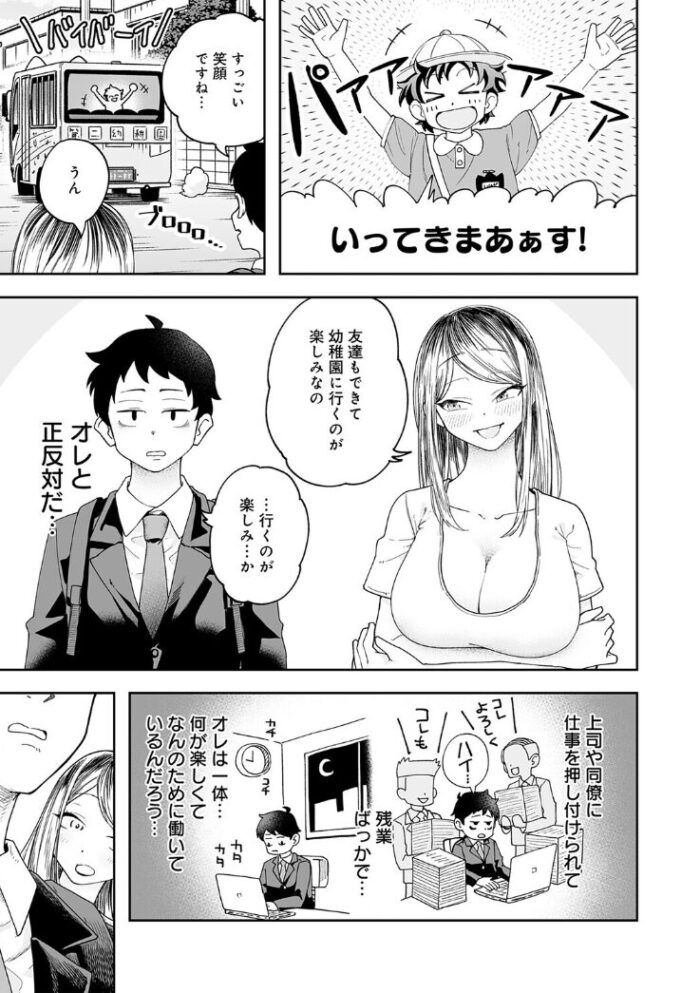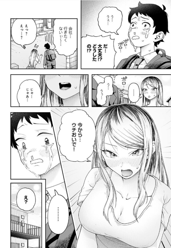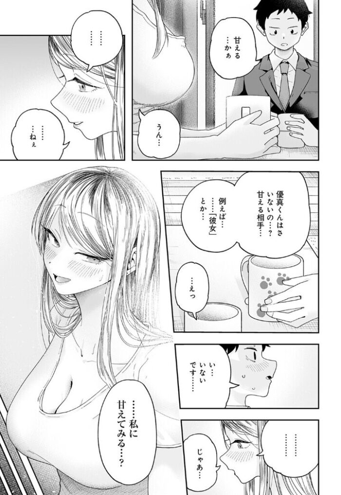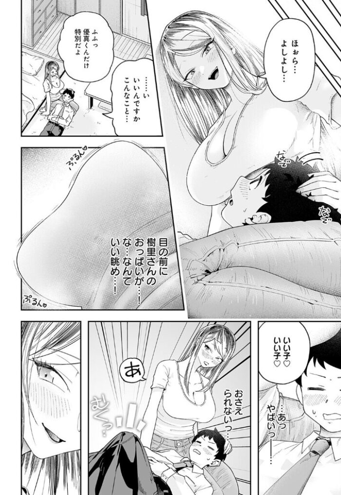 その男主人公が仕事に行くのが嫌で樹里のいる前で泣いてしまって、その樹里が男主人公にうちにおいでと誘うという展開から、これからどんな展開になるのかワクワクしながら読んでいました。                          男主人公は樹里から甘える相手がいるのかと聞かれた際に樹里がうちに甘えてみると言って甘えていくうちに勃起してしまう男主人公がもう笑ってしまいました。