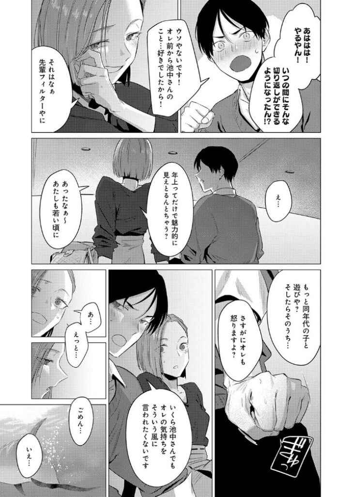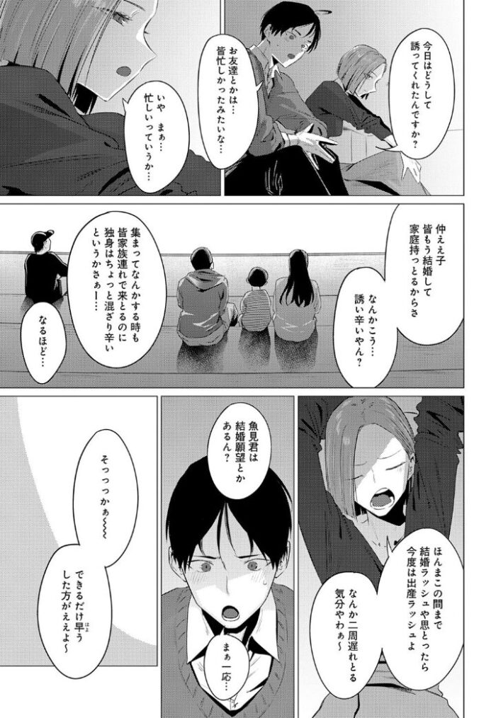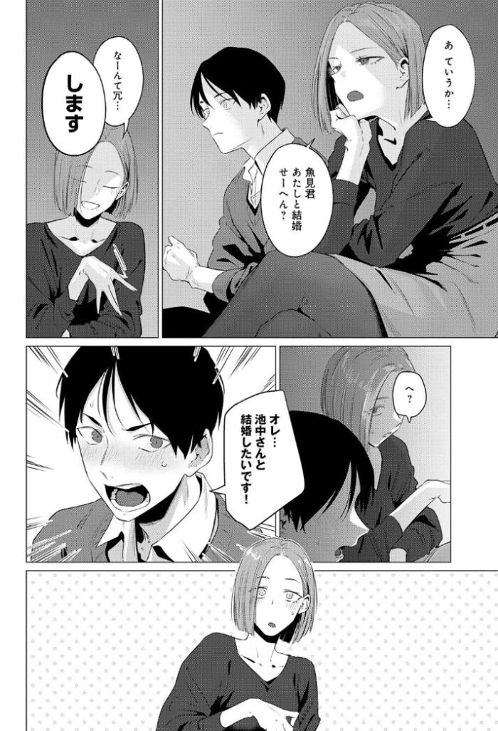 その後、身体の相性を確かめたいと池中からホテルに誘い、行為に至るという急展開に驚きました。        一度はすぐに果てて池中をがっかりさせてしまった魚見でしたが、2度目は長時間持ち、キスをしながら一緒に果てた姿を見て興奮しました。